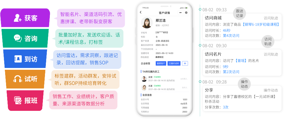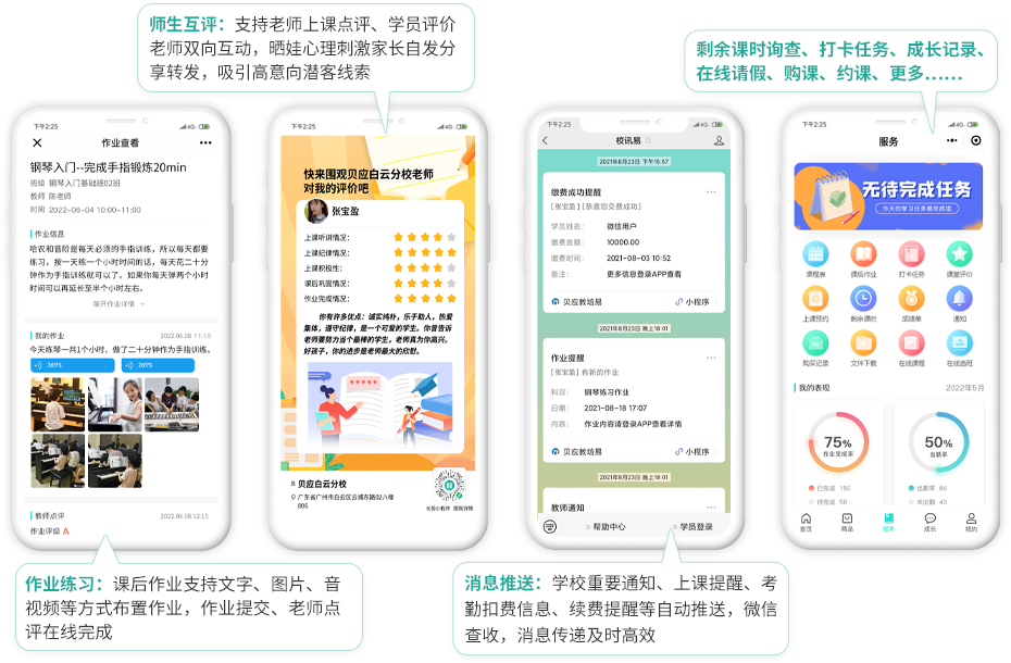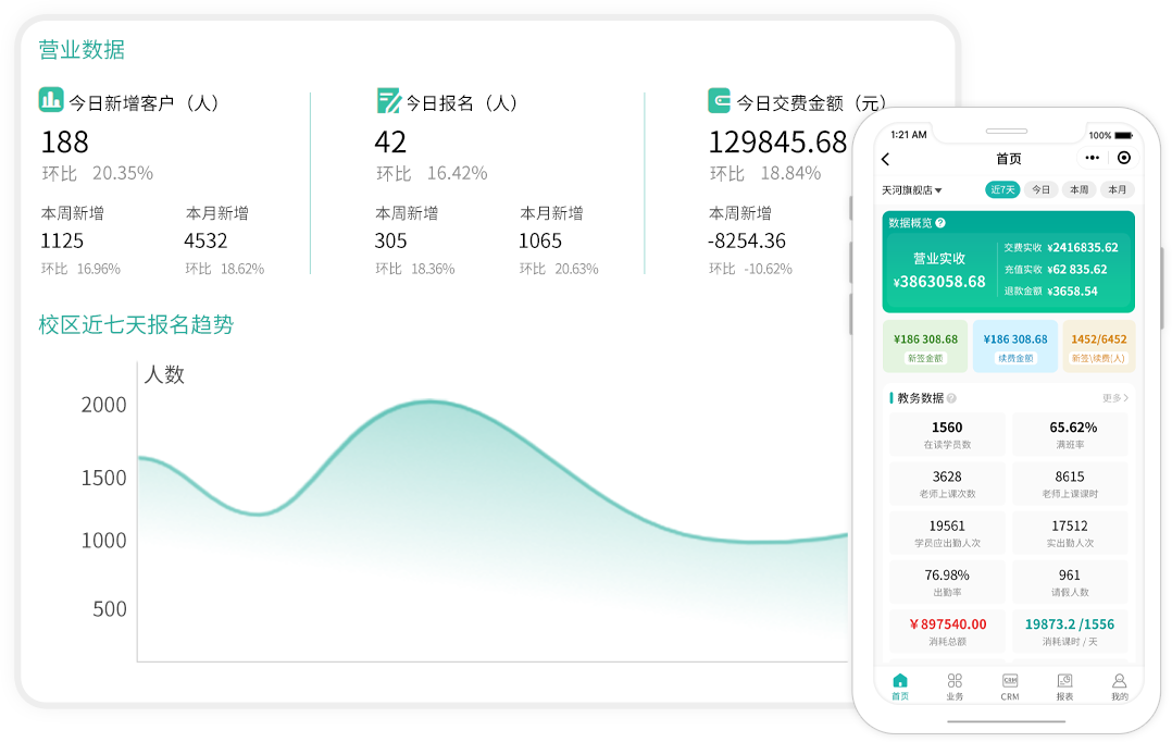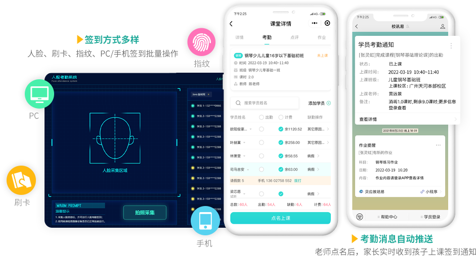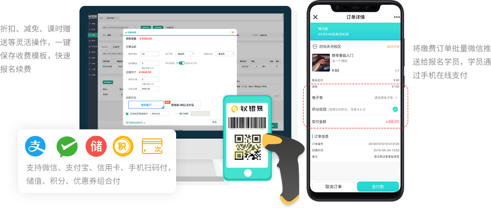 培训机构收银软件支持学员手机扫码快速缴费支付,支持微信、支付宝、信用卡,同时还能储值、积分、优惠券等任意组合支付,减少家长等待时间,提升前台接待效率。