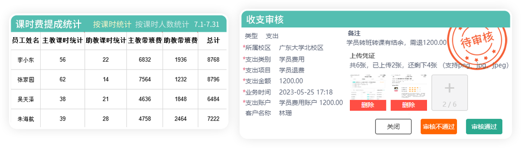 培训机构收银系统自动生成收费流水,每一笔收费明细清晰可查,交费金额、退费金额、结转金额、实收金额每日自动统计汇总,方便财务对账,课程顾问业绩提成自动核算,方便工资发放。